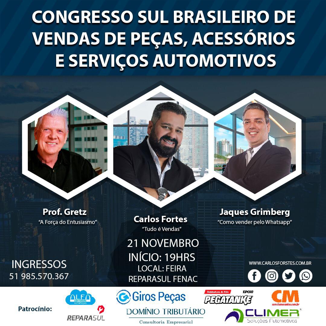 Participe do maior evento do segmento automotivo que acontece durante a REPARASUL 2019, três especialistas que lhe darão técnicas que vão alavancar suas vendas: Jaques GrimbergPalestra: Como Vender e Fidelizar Clientes pelo Whatsapp; Carlos FortesPalestra: Tudo é Vendas de Peças, ...